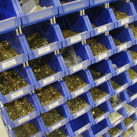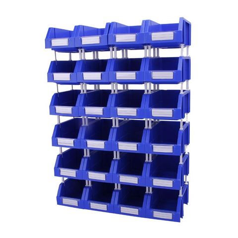صندوق تخزين بلاستيكي مثبت على الحائط في مخزن صناعي للأدوات وأجزاء لتنظيم اللوحات